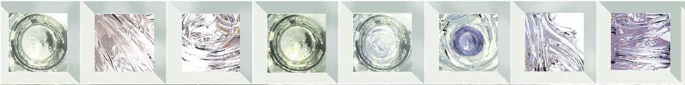 В коллекцию вошли два таких декора и три панно, состоящих из двух, шести и восьми элементов. В этой линейке присутствуют еще и особенные декорации: бордюры и декоры, похожие на стеклянную мозаику, собранную из квадратных чипов с фацетами и фантазийной разноцветной поверхностью. Они также ломают привычную плоскость и геометрию стен, внося в интерьер элемент мультиформатной укладки.