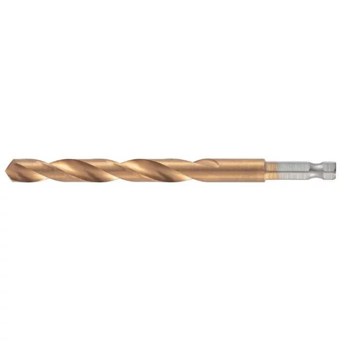 Сверло по металлу изготовлено из инструментальной легированной стали. Поверхность – из титаносодержащего сплава, что значительно повышает эксплуатационные характеристики сверл по металлу (покрытие из нитрида титана увеличивает стойкость инструмента в 2–2,5 раза). Шестигранный хвостовик предотвращает поворот в патроне.