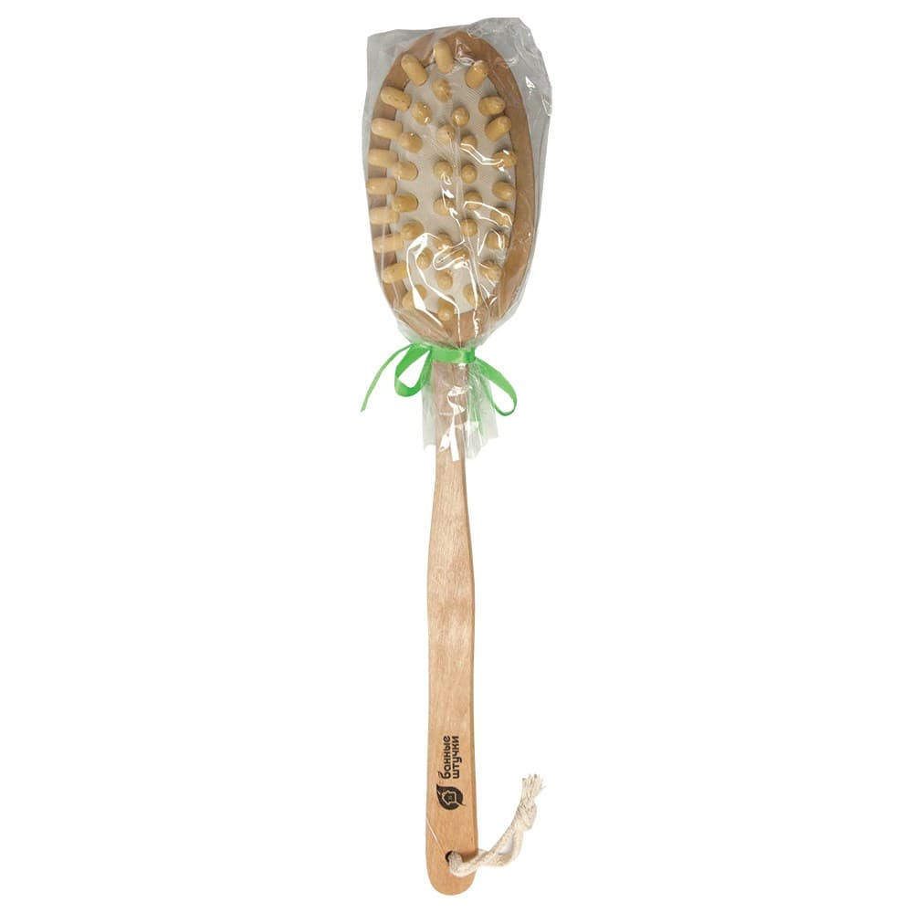 Деревянная щетка Банные штучки, двусторонняя с импульсным массажером, 42 см 40049 предназначена для массажа рук, ног и спины.
