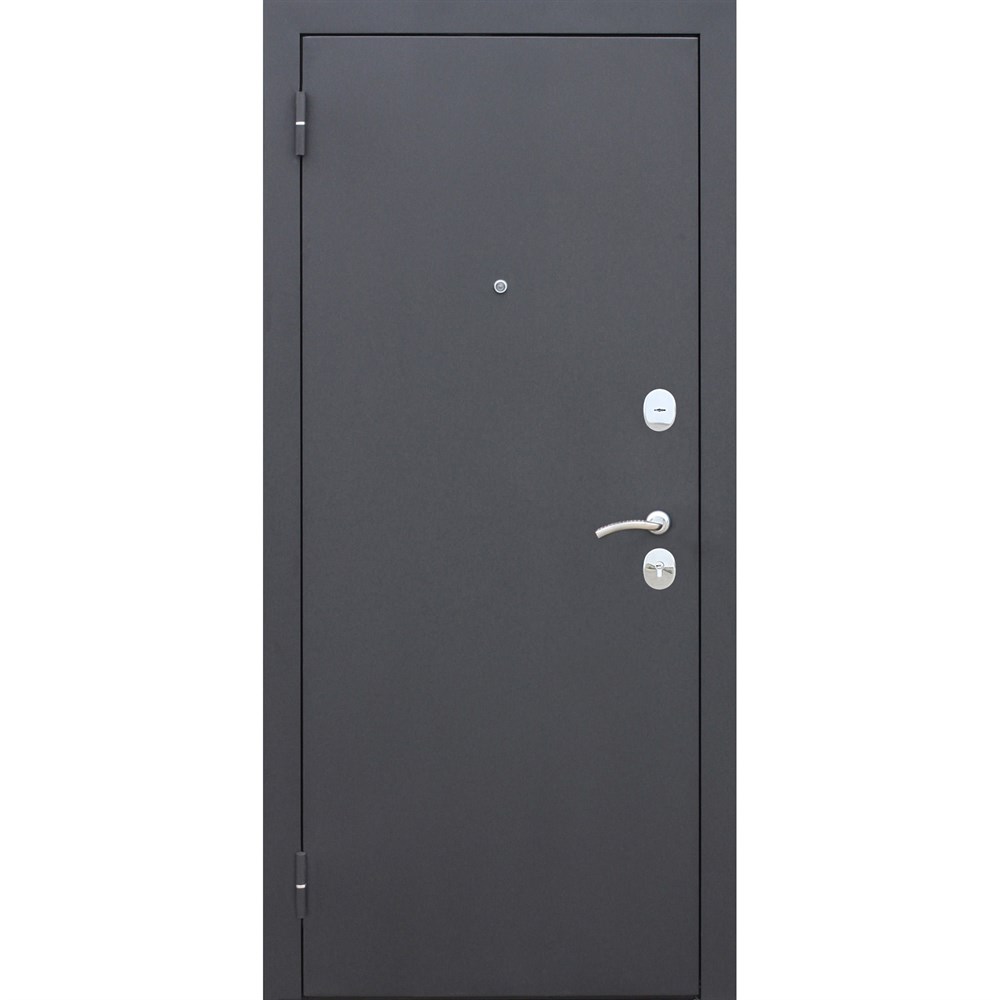 Современная одностворчатая конструкция со стационарным порогом, хромированными ручками и двумя наружными петлями. Предназначена для входного проема в квартиру многоэтажного дома.