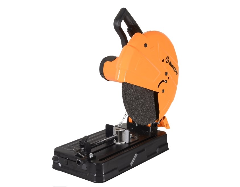 Кнопка запуска расположена на рукоятке. Для удобства выполнения серийных отрезных работ предусмотрена ее фиксация. Зажим в виде тисков позволяет производить резку под разным углом. Стопор, расположенный на корпусе инструмента, блокирует поворот диска для безопасной замены режущего элемента. Вентиляционные отверстия на корпусе препятствуют перегреву двигателя. Прочный металлический кожух надежно закрывает диск, защищая от стружки и искр.