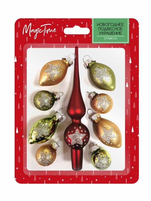 В наборе игрушек присутствует верхушка для елки, которая дарит приятное ощущение уютного и доброго праздника. Такой набор можно использовать как дополнение к композиции, так и как основной элемент ели. Также он послужит идеальным подарком для ваших близких и родных.