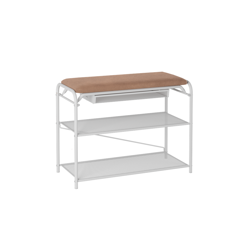 Подставка предназначена для хранения обуви и различных мелких предметов. Конструкция дополнена мягким сиденьем и выдвижным ящиком, что повышает её функциональность. Каркас отличается прочностью и устойчивостью при эксплуатации. Подходит для размещения в прихожей, гардеробной или офисном помещении.